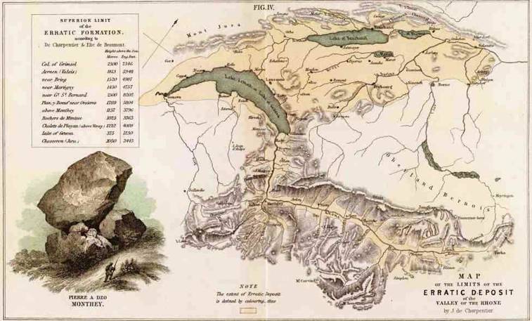 In a paper he published in 1835, Charpentier marshaled a great many facts in favor of the Alpine erratics having been transported out of the Mont Blanc Massif and into the Lake Geneva valley by a “glacier-monstre” (as he later called it, in 1841).